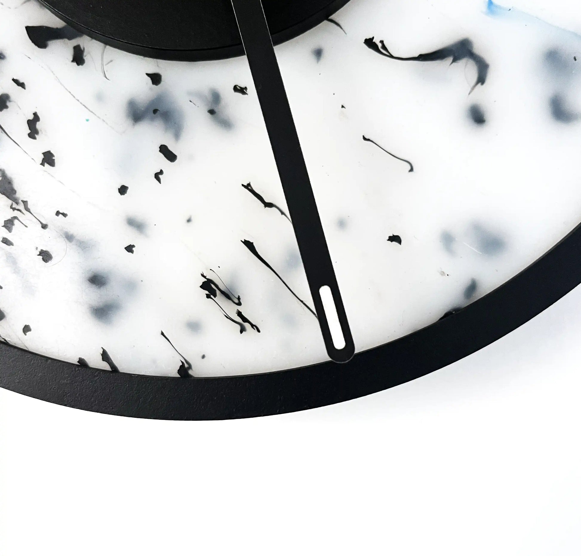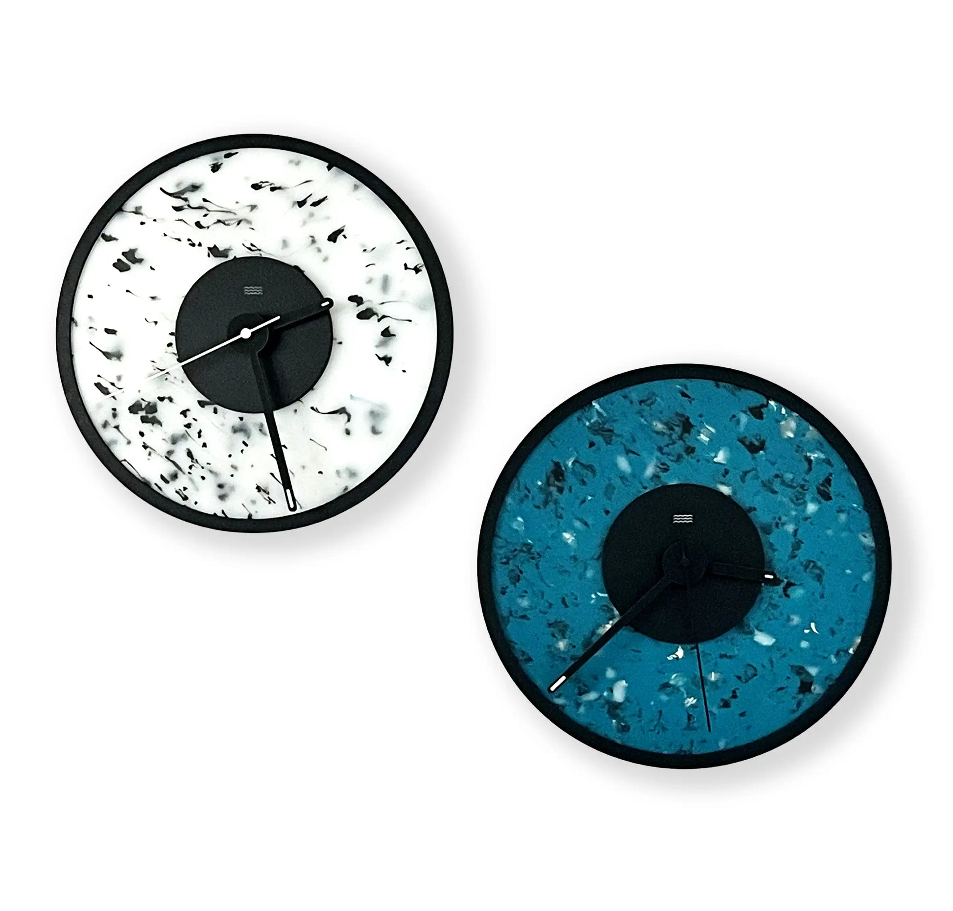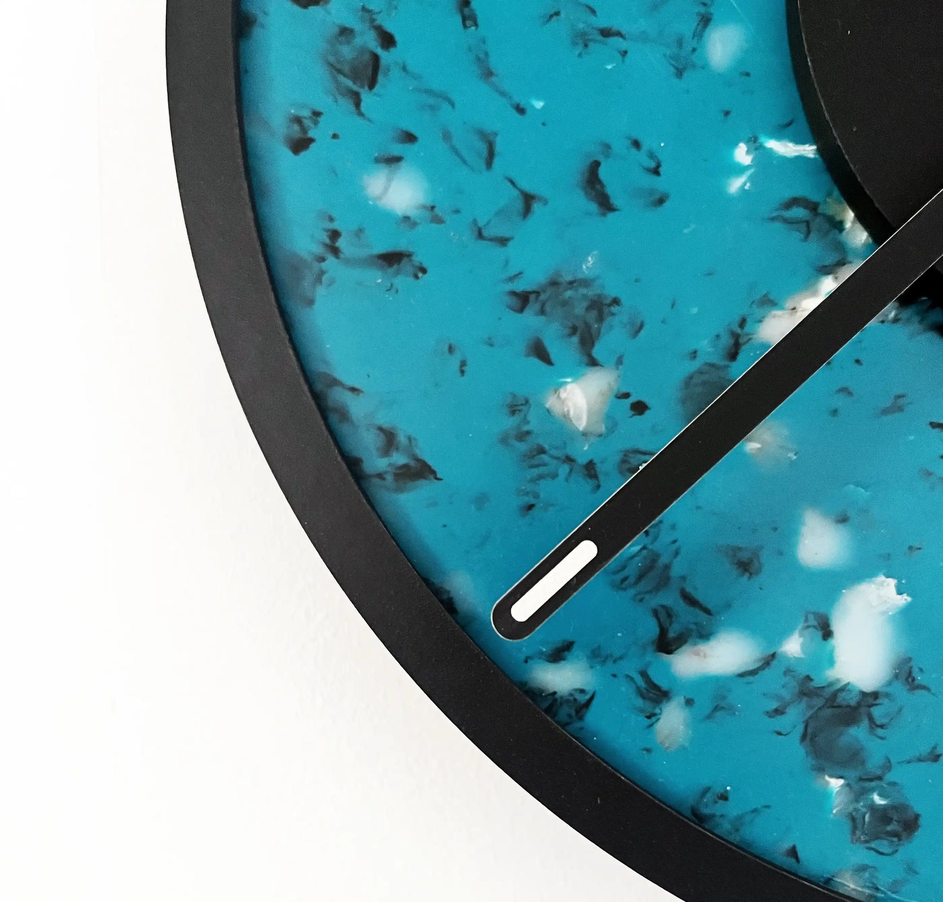 Fabriquée à partir de plastique recyclé collecté en circuit court entre le Pays Basque et les Landes par l'association Resak, chaque pièce est unique. Ces fragments de déchets, promis à l'oubli ou à l'enfouissement, sont transformés à la main pour devenir un objet à la fois utile, durable et chargé de sens — une horloge murale artisanale qui raconte le littoral atlantique.