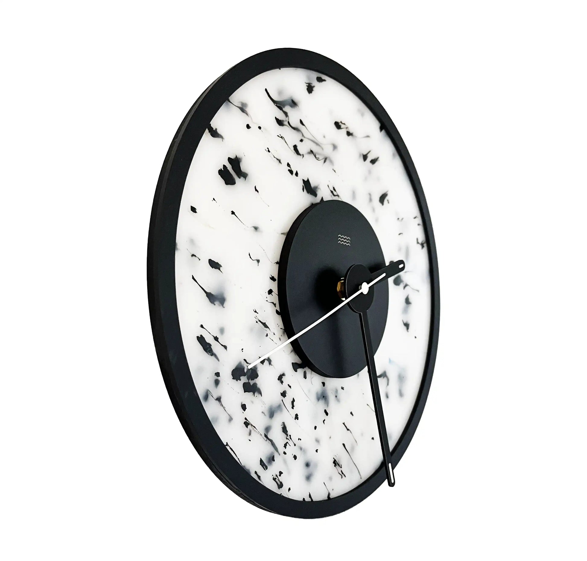 Contrairement à une horloge murale classique produite en série, Les Estagnots est façonnée à la main à partir de déchets plastiques collectés localement sur le littoral atlantique. Chaque cadran est donc littéralement unique — ses marbrures, ses teintes et ses variations sont le résultat direct de la matière brute collectée, impossible à reproduire à l'identique.